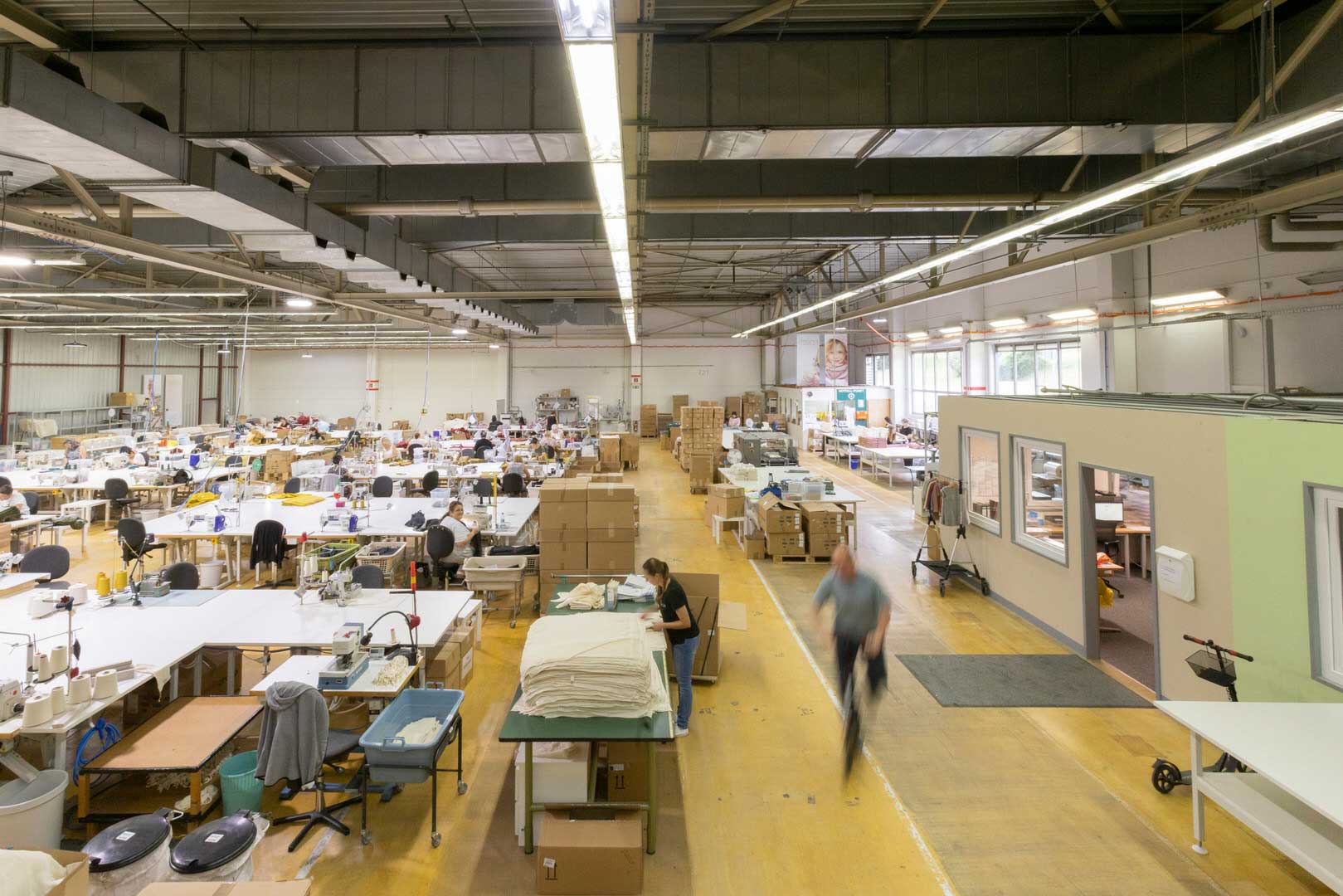 Längst sind wir aus der Garage ausgezogen und haben heute moderne, helle Produktionsräume. Doch noch immer fertigen wir alle disana Textilien bei uns im Haus. Vom dünnen Faden bis zum fertigen Artikel. Ein echtes Novum in der Textilindustrie, in der ein Artikel bei seiner Herstellung oft über tausende Kilometer reist.